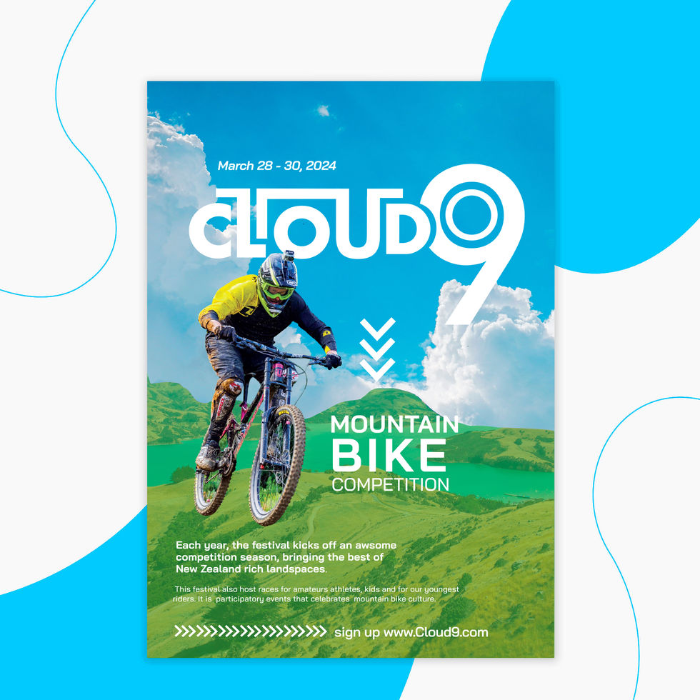 This is a mountain bike event in New Zealandâ€. ‬The†‬audience is people who are mountain bike enthusiasts or people who love extreme sportsâ€. ‬It combines landscape photos and topography to create movements within the layoutâ€.